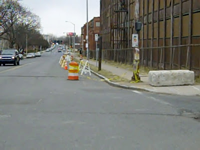 Barricades have been set up on the north side of the former mill and factory and the sidewalk has been blocked, apparently to try to keep pedestrians and motorists from being in the collapse zone when the building finally gives up.