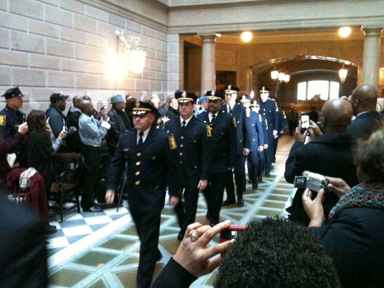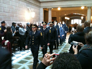 As visitors entered City Hall they were treated to a symbolic part of that vision. Three brand new black and white police cruisers were parked at the steps of City Hall, looking like the Christmas display's at Macy's when they highlight their best merchandise at their doorsteps to draw customers in. The cruiser display was the buzz among most people waiting for the new Chief's to march in.