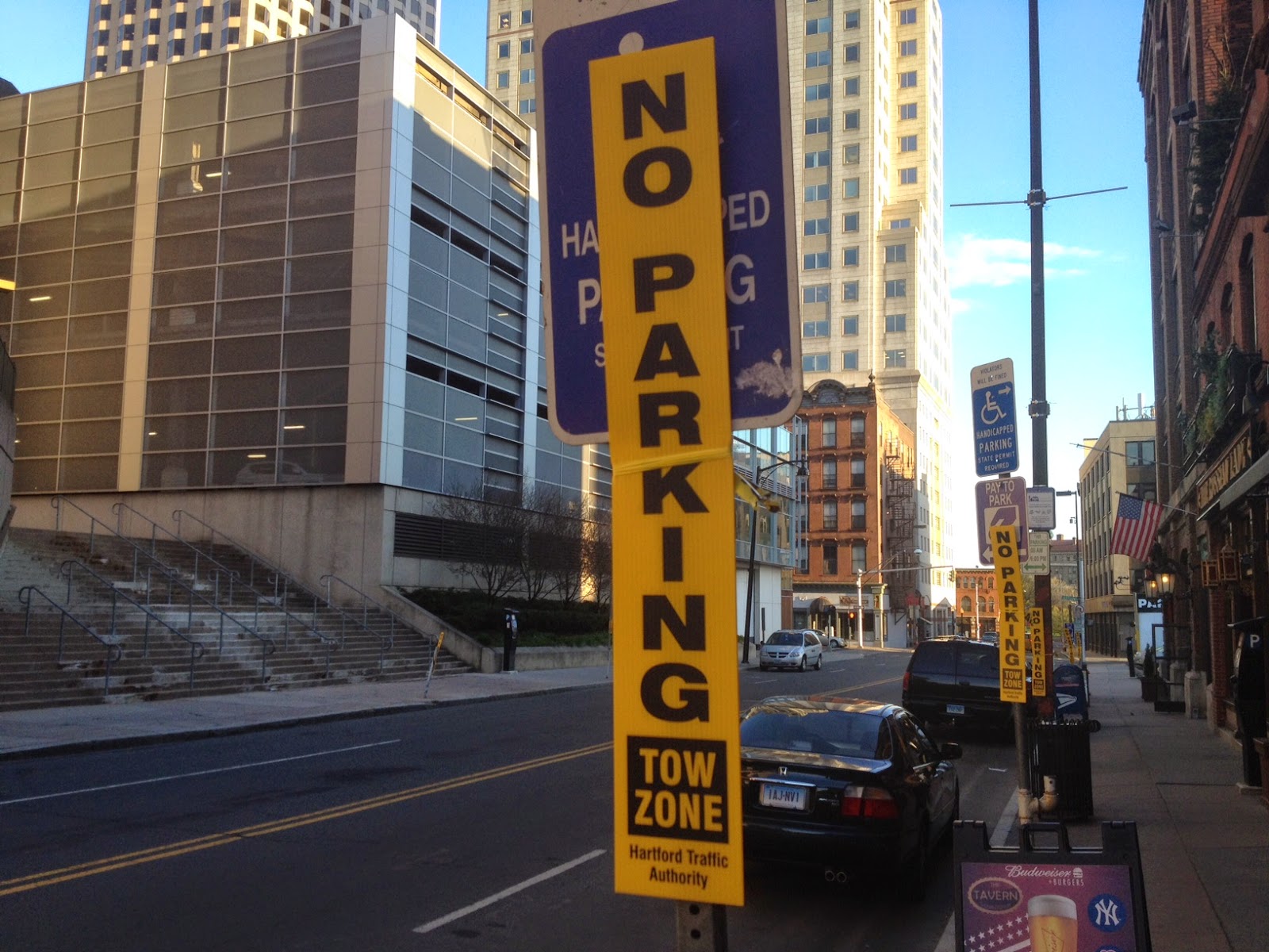 The placards were not put up by HPD, who would hopefully use a little more common sense. According to sources, these placards were the work of Hartford's Department of Public Works. Why couldn't they be put up later, at least after the dinner and bar crowd subsides so as not to kill the downtown business?