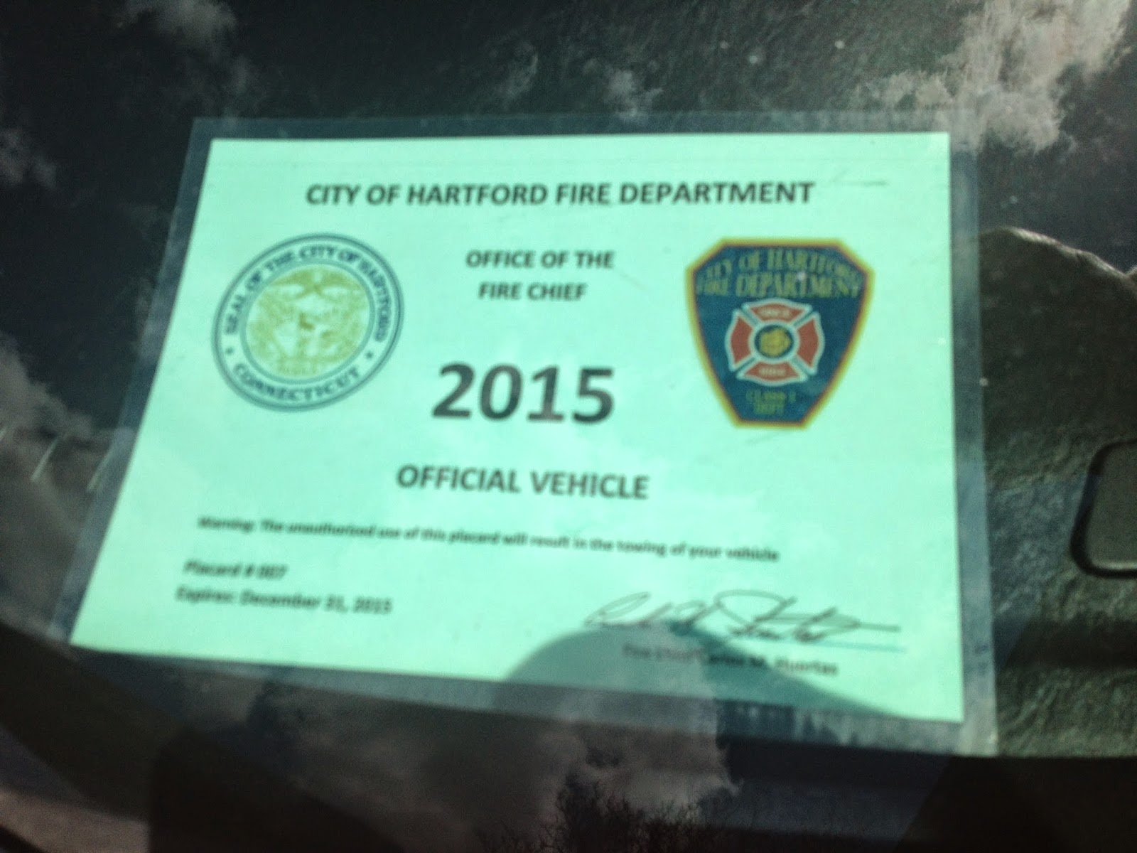 Now it seems that someone in the Hartford Fire Department has come up with the same scheme. I have seen numerous illegally parked vehicles around the downtown area, proudly displaying the "get out of jail free" placard , claiming the authority of the Hartford Fire Chief. Many of them are in close proximity to the Hartford Fire Union office  near Linden Place and the claim for being on official business is probably not legit.